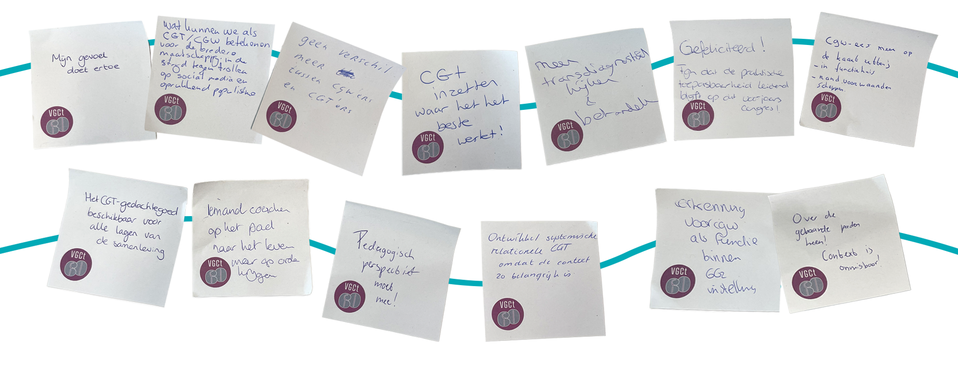 Zo vroegen wij de deelnemers op het voorjaarscongres: wat is jouw CGT-gedachte voor de toekomst? “Schrijf jouw gedachte op een post-it en hang hem op in onze grote jubileumboom.” Hieronder een aantal van deze CGT-gedachtes ter inspiratie.