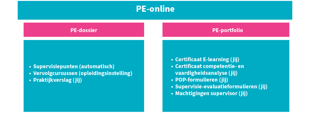 Als cgw’er i.o. krijg je je eigen digitale opleidingsdossier. Dit dossier bestaat uit het PE-dossier en het PE-portfolio. Hieronder zie je hoe de opleidingsonderdelen zijn ingedeeld in je PE-dossier en PE-portfolio en wie verantwoordelijk is voor het uploaden van de onderdelen.